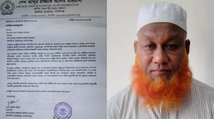 বাদশাহ মিয়া: নৈতিক শৃঙ্খলাভঙ্গের অভিযোগে গোপালগঞ্জের মুকসুদপুরের স্বনামধন্য প্রতিষ্ঠান শেখ আব্দুর রাজ্জাক আলিম মাদরাসার অধ্যক্ষ মাওলানা সাইফুল ইসলামকে সাময়িকভাবে বরখাস্ত করা হয়েছে। একই সঙ্গে মাদরাসার উপাধ্যক্ষ মাওলানা জাহিদুর রহমান মুন্সিকে read more